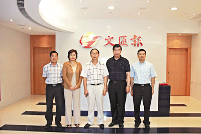 湖南省人民政府新聞辦主任孔和平(中)訪本報,受到本報總經理仇學忠(右二)、副總經理吳建芳(左二)等的熱情接待。本報記者樊宇燕 攝