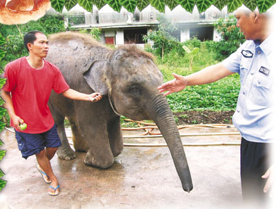 一路上,幹警們都說然然見了陶局長會流淚,記者半信半疑。來到金孔雀野生動物養殖救護中心,剛進門,一頭2米多高的小象就揮著鼻子向局長打招呼。「這就是然然了,我的小侄女。」陶雙壽邊說邊走近小象,然然把鼻子揮得更快了。當陶雙壽把胡蘿蔔餵進牠嘴裡,小象的眼裡真的噙滿了淚水。