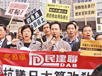 ■陳學鋒(持咪者)除地區服務外,在大事上亦毫不含糊。圖為他與立法會議員蔡素玉參與抗議日本篡改教科書。圖片由民建聯提供