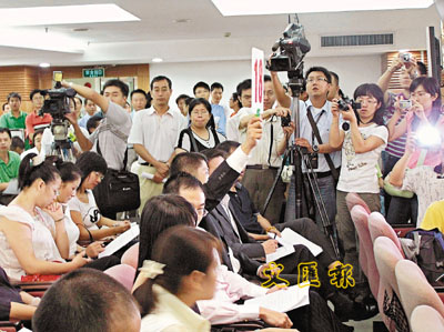 ■廣州獵德地塊昨日僅以高出底價19%的價格成交,遜於市場預期。圖為手持18號牌的富力地產及合景泰富代表在拍賣會上成功投地。 本報記者陳悅 攝