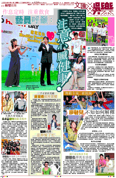 【本報訊】(記者 梁靜儀)「世界心臟日2007 心臟健康嘉年華」活動昨日於跑馬地馬場舉行,陳曉東以「強心之星」身份聯同一班演出嘉賓,包括薛家燕、方力申、泳兒、吳雨霏、官恩娜、周麗淇、李逸朗、裕美及鄧穎芝等出席,透過活動呼籲市民注意心臟健康。