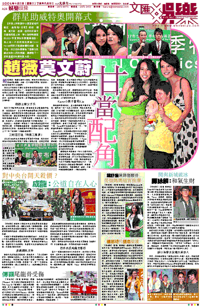 與郎朗和譚盾相比,莫文蔚和趙薇的攜手出場,顯然有一加一大於二的效果。兩位女星早在電影《夕陽天使》中有過親密合作,這次又同被邀請擔任特奧會的全球形象大使,自然表現得分外親熱。雖然當天的話題被嚴格限制在特奧的主題上,但依然有記者突然要求兩人介紹彼此間的關係。沒想到一向敢作敢為的兩人立刻當眾親嘴,重現《夕陽天使》最後曖昧一幕。Karen還不忘頑皮地加上一句,「電影裡的那個吻一直讓我忘不了啊。」