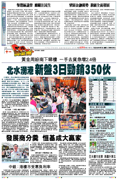 【本報訊】 (記者 蘇曉蕾)內地經濟發展急速,投資氣氛愈演愈烈,內地居民在股市中滿載而歸,積聚了強大的購買力,令「十一」黃金周期間資金如洩洪般湧入香港,帶動了本港樓市於國慶假期的成交,在過去三天共售逾350伙,較去年國慶假期時沽出約103伙,升幅達2.39倍。昨日代理行港置及美聯分別組織內地睇樓來港參觀。其中,率領120名內地客來港睇盤的港置行政總裁胡日發謂,往年沒有注意到內地的客源,但今年開始在深圳組織看樓團,來自內地客戶的生意額出現倍數增長。