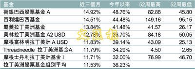 佔近3個月榜首的荷銀巴西股票基金,基金在2006年表現為48.76%,基金平均市盈率、最差季度收益和標準差為12.11倍、19.45%及21.12。