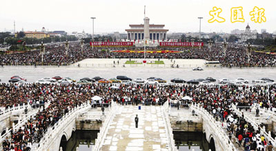 記者1日下午4時到達天安門廣場時發現,廣場上仍然人山人海,數萬遊客聚集在此等待定於5時舉行的降旗儀式。為了這些遊客的安全,天安門廣場安保人員驟增了很多,除了平時維持秩序的武警,警察和城管也齊上陣。