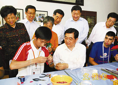 2007年世界夏季特殊奧林匹克運動會將於2日在上海開幕。1日上午一抵達上海,胡錦濤來到虹口區曲陽社區專門為智障人士設立的「陽光之家」,實地察看智障人士在這裡開展生活技能學習、康復訓練、特奧運動的情況。看到智障人士在「陽光之家」學到不少東西,生活得很開心,胡錦濤感到十分高興。他勉勵智障人士好好學習,勤於鍛煉,不斷取得新的進步。胡錦濤同前來這裡活動的希臘特奧運動員交談,歡迎他們來上海參加特奧會,祝他們取得好成績。