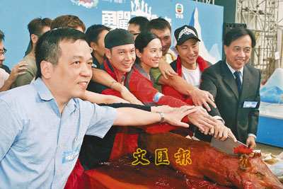 ■梁榮忠、郭羨妮、崔建邦遠征玉珠峰之前拜神切燒豬,祈求征途順利。