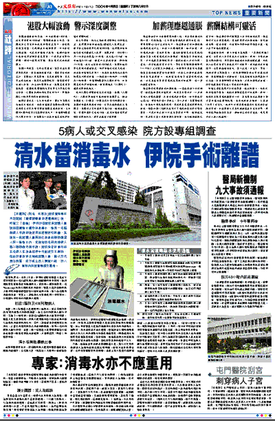 【本報訊】(記者 朱樂汶)醫院管理局本月起實施「嚴重醫療事故通報機制」後,昨首次「自爆」,伊利沙伯醫院有醫護人員誤將過濾清水當作消毒藥水,清洗一名腦科病人手術前後使用的超聲波引導器,其後另一批醫護人員再將已消毒的膀胱鏡浸入同一盤清水內,先後替四名前列腺病人進行膀胱鏡外科手術。醫院指牽涉事件的五名病人在消毒程序中可能被交叉感染,但由於事故涉及幾組醫護人員,難以交代責任問題,院方成立四人調查小組,於八星期內向醫管局提交報告。