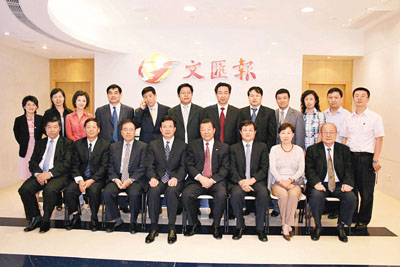 來港參加「孔子誕辰2558年系列活動」的山東省委常委、宣傳部長李群(前左四),宣傳部副部長、省政府新聞發言人劉保聚(前左六)等一行昨日到訪本報,受到本報張國良社長(前左五)的熱烈歡迎。本報副社長潘一黎(前左三)、副社長韓力(前右二)、總經理仇學忠(前左一)一同參加了會面。客人又參觀了本報編輯部和印務中心。 本報記者解玲 攝