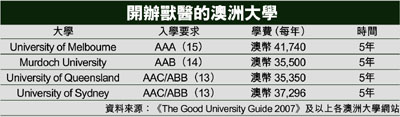 現時澳洲約有4所大學分校提供獸醫課程,而這4所大學的獸醫課程均合符香港特區政府的《獸醫註冊條例》的規定,並得到獸醫管理局的認可,畢業生可於香港註冊成為執業獸醫。根據澳洲的《The Good Universities Guide 2007》,入讀獸醫科的難度屬五星級(排名由一至五星級,一星級為最易,五星級為最難),它的起薪工資同屬五星級。獸醫畢業生的就業情況理想,Seeking Work%(找尋工作比率)只有5%,平均起薪點為每年38,217澳元(相等於256,054港元)。獸醫畢業生一般會選擇在私人獸醫診所工作,工資相當豐厚;部分畢業生會投身公營機構或相關行業。