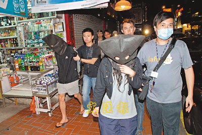 ■沙咀道涉嫌販毒被捕男女被探員蒙頭帶走。