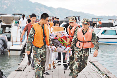 ■福建邊防官兵救助寧德東沖島漁排上一名不慎摔倒的60歲老人。 中新社
