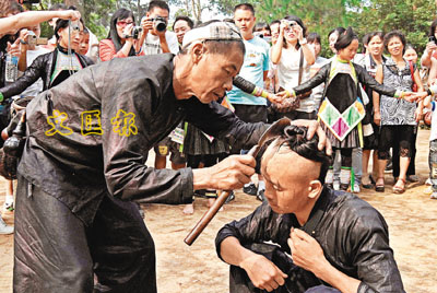 10月6日,貴州省從江縣苗族村寨中,村民向遊客展示古老的鐮刀剃頭民俗。新華社