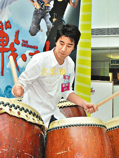 【本報訊】(記者 梁靜儀)房祖名與李心潔昨日齊出席電影《戰.鼓》的宣傳活動,大會原定安排台灣著名鼓藝劇團「優人神鼓」出席,但因台灣懸掛颱風關係而未能來港獻技,臨時由房祖名、李心潔和導演畢國智即席表演打鼓。由於影片已拍了一段時間,祖名坦言對打鼓不太熟練,唯有靠少許拍片時的記憶相助。鼓法並不算精的他,卻敢取笑李心潔拍打鼓戲時手腳僵硬。祖名解釋自己只是用激將法來激勵李心潔而已。
