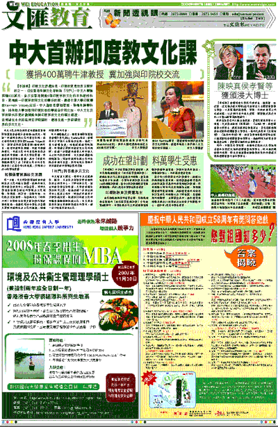 中大文化及宗教研究系昨獲國際奎師那知覺協會香港分會捐助400萬元,增設一印度宗教與文化的專任教席,並已委聘牛津大學教授Kenneth Valpey出任。該學系亦將全港首辦4個相關科目,包括印度宗教傳統、印度的傳統與現代、印度文化中的自我與身份及國際研究專題,供中大學生選修,亦歡迎國際交換生修讀。其中「印度的傳統與現代」及「印度文化中的自我與身份」已在今年9月開班,分別有12及16名學生選修。