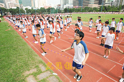 ■香島中學昨舉行「千人大繩操」,展示該校學生的動感及合作性,以響應「北京奧運,我的奧運」口號,聲勢浩大地迎接08年北京奧運。 本報記者劉國權 攝
