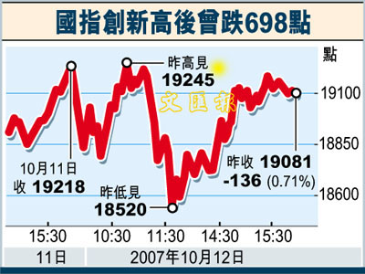 貴金屬股份方面,亦不乏逆市上升股份,例如馬鋼(323)升2%,鞍鋼(347)大升7%,因有證券商將其目標價上調至40元,中鋁(2600)微升0.6%。另外,紫金(2899)升2.7%,招金(1818)大升6%,洛鉬(3993)升5%。而國指早段曾跌700點,但在中石油急升下,尾市曾創19,245點新高,全日高低波幅逾720點,收報19,081.3點,只跌136.7點。