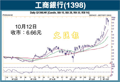 假設長期股本回報率21.2%、股本成本10.3%及長期增長率5.3%,並根據我們3階段股利折現模型,我們得出工行的目標價為8港元(昨收6.06元),相等於08年度市賬率4.3倍及08年度市盈率23倍,以其良好質素而言,估值並不昂貴,現價較目標價有32%上升空間,將評級由觀望上調至買入。