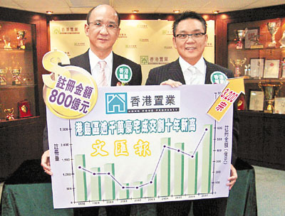 ■胡日發(左)指,港島逾千萬元豪宅的註冊價量均較去年倍升。旁為李志成。