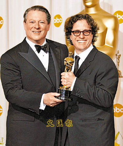 ■戈爾(左)製作的《絕望真相》今年2月奪得奧斯卡紀錄片大獎。 美聯社