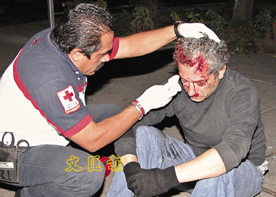 ■「食人魔」卡爾亞為逃避追捕跳露台兼被車撞傷,接受救護人員急救後,面上仍血跡斑斑。 美聯社