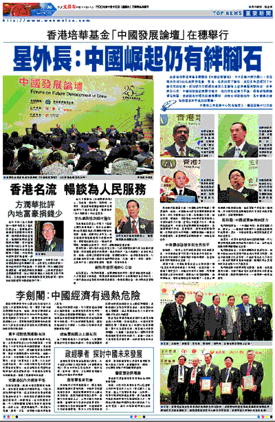 馬和勵還對中國發展提出建議。他說,在保護環境方面,中國不能走資本主義國家先污染後治理的舊路,應該利用高科技,一邊發展一邊整治環境。 ■本報珠三角新聞中心記者羅愛文、唐苗苗廣州12日電