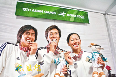 ★(左起)陳敬然、何智豪和陳慧琪在多哈亞運摘牌,出戰京奧機會增。 資料圖片