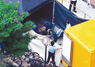 ■仵工將三母子的遺體逐一抬離現場時,警方拉起布幕遮擋,以免引起住客不安。