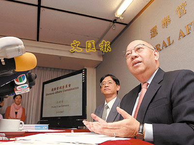 ■區議會選舉提名期今日結束,截至周六中午選舉主任共接獲860份提名。圖為早前彭鍵基(右)講解區議會選舉安排。 資料圖片