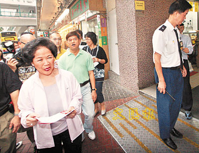 ■陳方安生昨到小西灣派發單張,期間多次被屋苑管理員阻止進入屋苑。 本報記者彭子文 攝