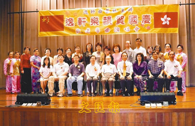 【本報訊】為慶祝中華人民共和國成立58周年,逸軒曲藝社日前假荃灣梨木樹社區會堂,舉辦「逸軒樂韻賀國慶」敬老粵曲演唱會。大會邀請了逾10個地區曲藝社的友好,同台獻唱經典粵曲和其他歌舞表演,吸引了區內長者踴躍捧場,並且全場滿座。多個精彩的演出,讓長者看得如癡如醉,博得熱烈的好評。
