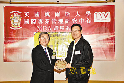 ■美聯集團主席黃建業(右)日前獲邀出席一公開講座,向在場約百名MBA學生闡述本港樓市現況及前瞻,並獲該校校長致送紀念品。