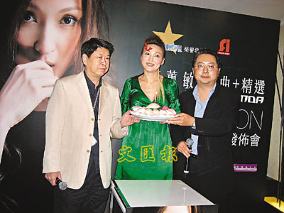 【本報訊】(記者 李慶全)李惠敏(Amanda)六年沒推出唱片,即將出一張新曲加精選唱片,昨日召開記者會,她一身Dior裝扮,而昨日適逢是她的農曆生日,大會特別推出壽包為她祝賀。Amanda獲贊助服裝外,也與化妝師特別創作了一個「3D」立體化妝,在其右眼眼眉上黐上紙條,寓意是將自己當作禮物送給一直喜歡她的歌迷,來拆她這份禮物。今次選在農曆生日開記者會,Amanda表示並非刻意,像10月4日西曆生日於飛機上度過,大個女也不用慶祝,所以昨日有壽包吃已是很高興,也有感身邊能有一班好朋友已足夠。