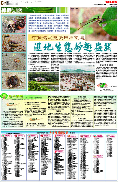 如有空閒的半天,並遇退潮的時間,我會立刻想到去濕地暢遊。香港的濕地種類分淡水、鹹水及鹹淡水。不同的濕地生態環境都有不同的動植物,值得我們觀看。這次我就選擇到汀角沙灘,它位於新界東北,八仙嶺山腳下,沿大埔向汀角路靠海的一邊。這裡有一大片紅樹林,如適逢退潮,大片的紅樹林和沙灘呈現眼前,感覺壯觀。這片沙灘,由三門仔旁的避風塘,沿船灣海一直連接到大美督。