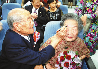 為慶祝農曆九九重陽節,屏東市公所16日舉辦「阿公為阿嬤畫眉」活動,圖為在場的一對阿公阿嬤第一次享受這樣的「畫眉樂」。 中央社