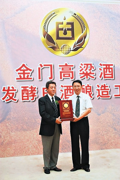 ■今年8月3日,金酒總經理王毅民(左)在北京領取「純糧釀造工藝認證」。