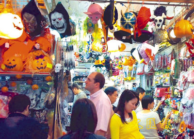 萬聖節臨近,一些商店銷售各種妖魔鬼怪的面具、服裝、裝飾品等,吸引大批顧客。 中央社