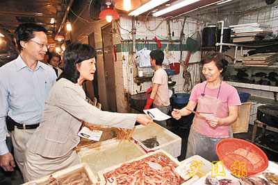 ■葉劉淑儀到西灣河街市拉票,向魚檔商販派發單張爭取支持。本報記者劉國權 攝