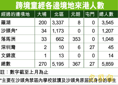 教育局資料顯示,今學年有5,859名幼稚園至中學的跨境學童來港讀書,較04/05學年的3,803名大幅上升54%,其中幼稚園生更增近1倍,有關數字從大埔、北區等4區的學校收集而得。而由本學年起,當局亦開始分別統計經各邊境地點來港上學的跨境學童人數,至今年9月為止,羅湖、沙頭角及落馬洲是較多跨境學童使用的邊境口岸。