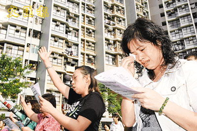 或許被場面感染了,令不少有同類經歷的居民感到傷口劇痛,居民黃妙霞嗚咽了。她說:「15年前,我由內地嫁來香港,就開始住在天水圍。大女就讀幼稚園開始,丈夫再禁不住他的壞脾氣。動不動就鬧我,打我,我都忍他。但有次忍不住報警,竟有人對我說『都未畀人斬死呀!』」黃雖然沒被斬死,但她的左耳因挨打導致失聰。