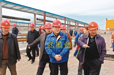 ■王玉普(前右二)到生產一線檢查工作。大慶油田有限責任公司提供