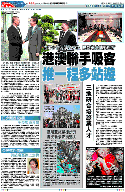 此外,由於文物旅遊漸受旅客歡迎,旅發局昨向澳門當局推介「世界文化遺產行程」,作為粵港澳三地合作頭炮。旅發局發言人說,計劃年底前推出一個五天三地旅行團,行程將包括香港曾獲聯合國教科文組織文物古跡保護獎的西貢洪聖古廟、白沙灣及吊鐘洲等景點,亦會參觀廣東省開平的碉堡、赤坎古鎮,而澳門的大三巴牌坊、盧家大屋及玫瑰堂等被聯合國訂定為「世界遺產」的景點,亦包括在行程中。發言人透露,旅行團主要針對日本、韓國及英美等地旅客,業界認為行程可行,價錢待定。