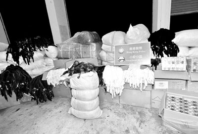 ■水警展示截獲的走私皮草及電腦零件。本報記者溫瑞麟 攝