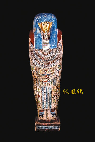Djeho's inner coffin is a classic example of an anthropoid mummy-case made for a man of high status. The divine qualities attained by the deceased in the next life are indicated by the application of gold leaf to the face and by the blue colouring of the wig; texts record that the gods were supposed to have flesh of gold and hair of lapis lazuli. Djeho's plaited and curled false-beard is another sign of his elevation to a higher state of being. The rectangular pedestal which supports the feet emphasises the coffin's sculptural qualities, and makes an allusion to the Opening of the Mouth – the ritual by which the mummy, placed upright at the entrance to the tomb – was reanimated. ■資料:香港藝術館
