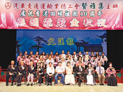 【本報訊】汽車交通運輸業總工會屬下婦女組織為慶祝香港回歸祖國10周年,日前假座牛池灣文娛中心劇院舉行了一個名為「粵韻霓裳金秋夜」的粵曲欣賞晚會。當天賢雅集粵曲班組一眾精英學員,實行以我國國萃文化粵韻歌聲,齊齊歌頌香港回歸祖國懷抱10周年這個大日子。