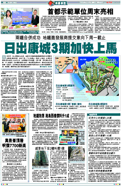 已連奪1及2期發展權的長實集團副首席經理(營業)黃思聰昨表示,長實一向對市區優質地皮,包括優質地鐵上蓋物業均感興趣,既然長實已先後奪得日出康城1期及2期的發展權,一定會對3期仔細進行研究。他續稱,日出康城1期「首都」即將推售,但相信會先於3期截標的時間,因此,不會影響首都的推售部署,至於3期的補地價受到首都的開售價影響,他則認為,能夠賣得的價錢便是市價,反映市場的接受能力,相信互相不會有影響。信和置業聯席董事鍾少權指出,集團對所有地皮都會有興趣。
