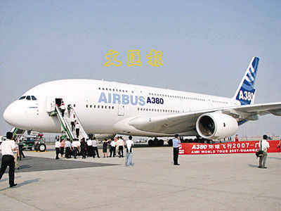 ■空中客車A380飛機23日飛抵廣州白雲機場,拉開了為期一周的大陸演示飛行序幕。 本報珠三角新聞中心記者唐苗苗 攝