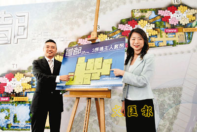 ■長實副首席助理(營業)黃思聰(左)及助理營業經理何家欣,介紹首都3房平面圖。本報記者張偉民 攝