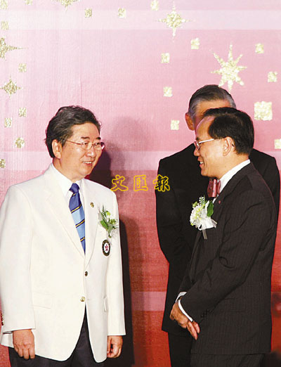 ■ 香港特殊奧運主席葉肇和(左)在慶功宴上,與特首曾蔭權(右)交談甚歡。本報記者高仲明 攝