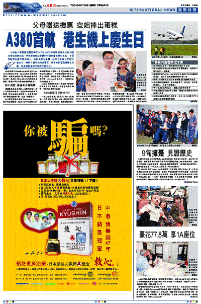 全球最大兼首架雙層客機空中巴士A380昨日順利完成由新加坡飛悉尼的處女航,乘客對這架巨無霸的設備和服務讚口不絕,不過要數畢生難忘則非機上一名香港學生莫屬,他昨日在機上度過22歲生日,機組人員突然捧出蛋糕,所有乘客都為他唱生日歌,他自言這是22年來最好的生日。